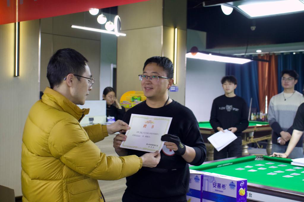 赛事在策划过程中,得到了教职工的广泛关注。公司工会依托本次赛事,牵头组织参赛教职工成立“小泰教职工台球俱乐部”,聘请财务处李磊担任俱乐部会长。白军彭为李磊颁发聘书,现场参赛选手向首任会长鼓掌祝贺。李磊表示,他将全力以赴,带领俱乐部成员共同推动台球运动在校园内的普及和发展,为教职工们提供一个更加广阔的交流和展示平台。