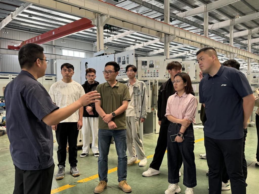 师生们在龙翔新能源副总经理贾东龙的带领下,参观了龙翔变压器开关柜生产线、绿能充电站示范场站及在建兆瓦级充电堆工程,对即将建设的智能化车间、公司产品及风光储充一体化绿能充电站等相关产品的生产流程做了详细介绍。