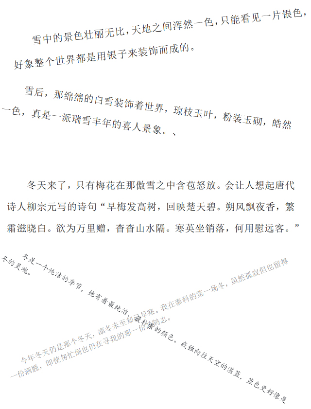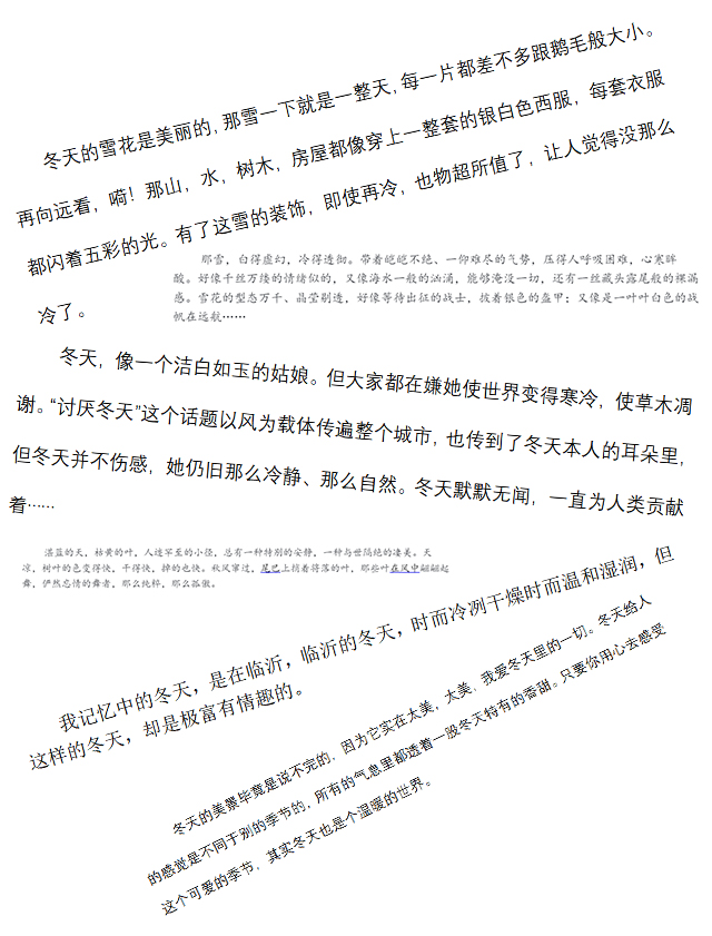 硕果累累的秋日已经过去,伴随而来的是冷冽的寒风,在这寒冷的冬天总有一些温暖的事情值得去期待。朱新宇同学写下“冬天虽然没有春天的鸟语花香,没有夏天那火红的太阳,没有秋天的丰收,但是冬天有自己独特的美。”春天是温和的,夏天是热情的,秋天是清高的,而冬天却是冷艳的,冬天有着自己独特的美。